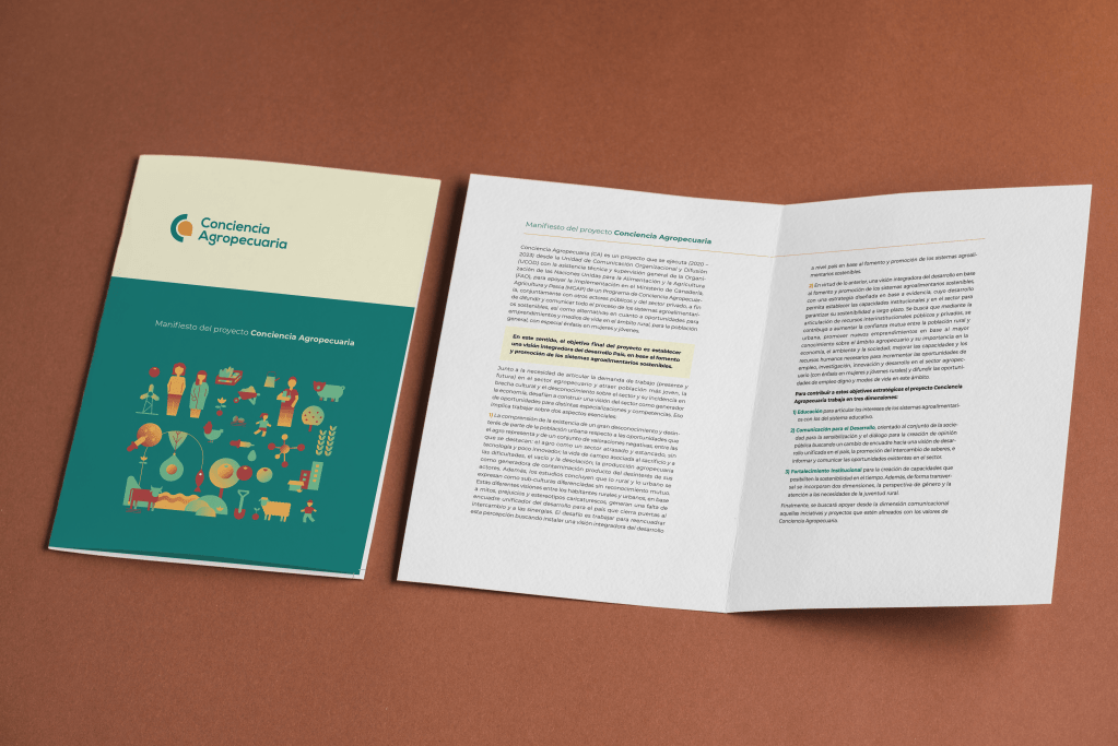 Within the framework of the visual communication design consultancy for the Conciencia Agropecuaria project of FAO Uruguay and the Ministry of Livestock, Agriculture and Fisheries, we are working with a methodology that is part of the strategy presented in the Annual Operational Plan, which allows the systematization of the graphic identity to articulate the project’s communication products.